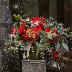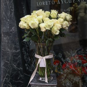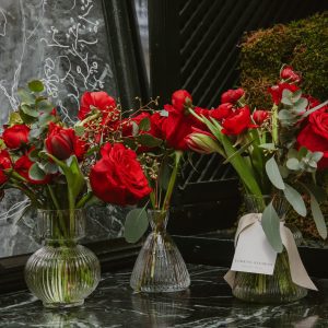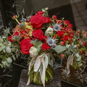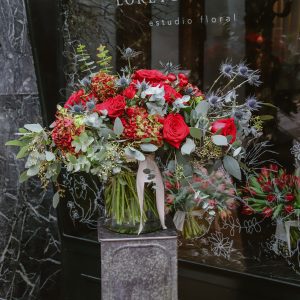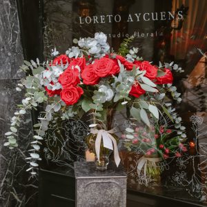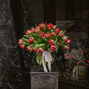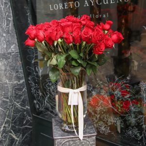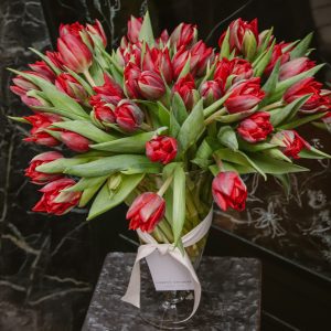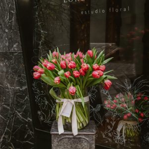 • Arreglo grande de tulipanes rojos en jarrón copa