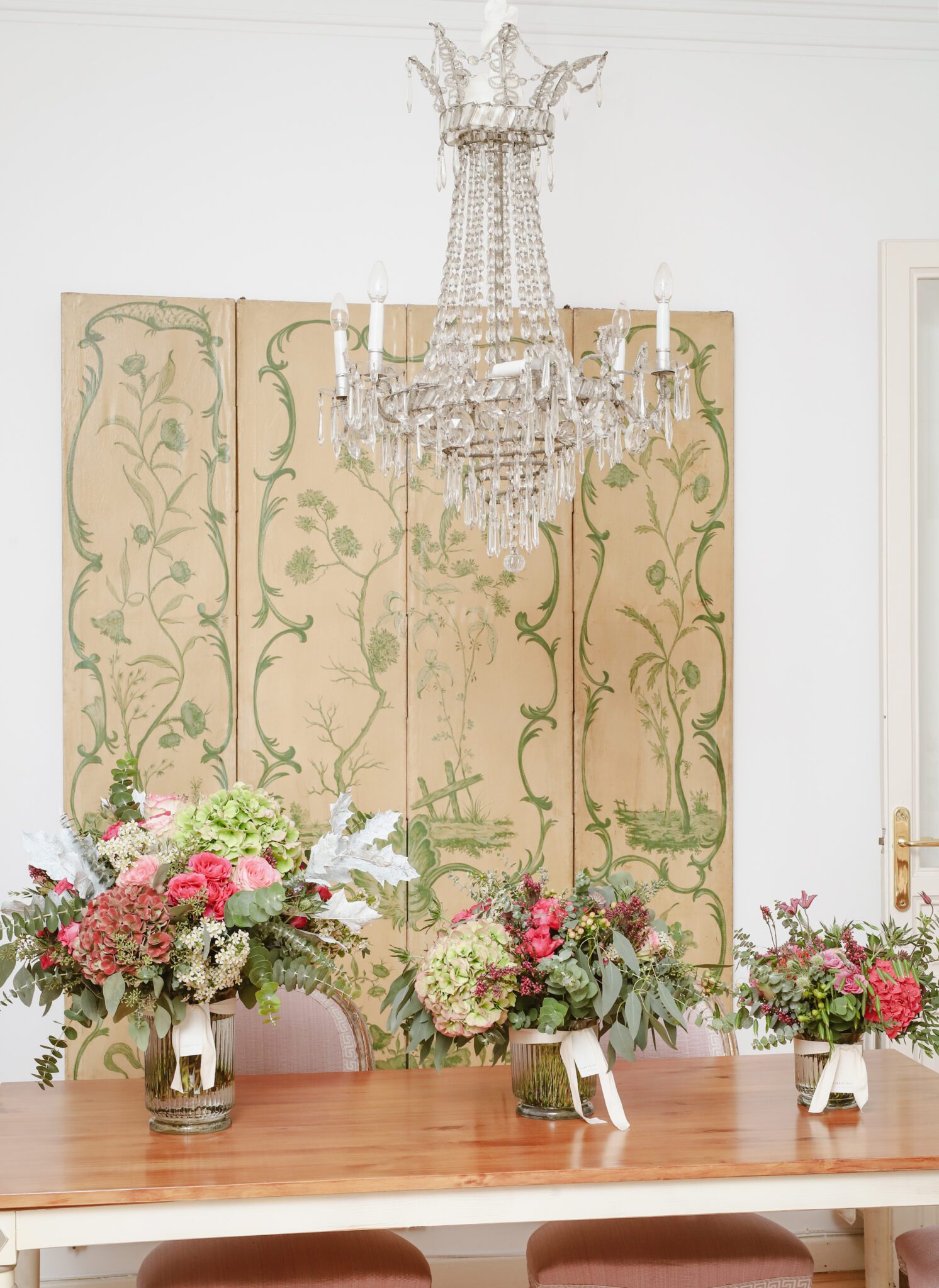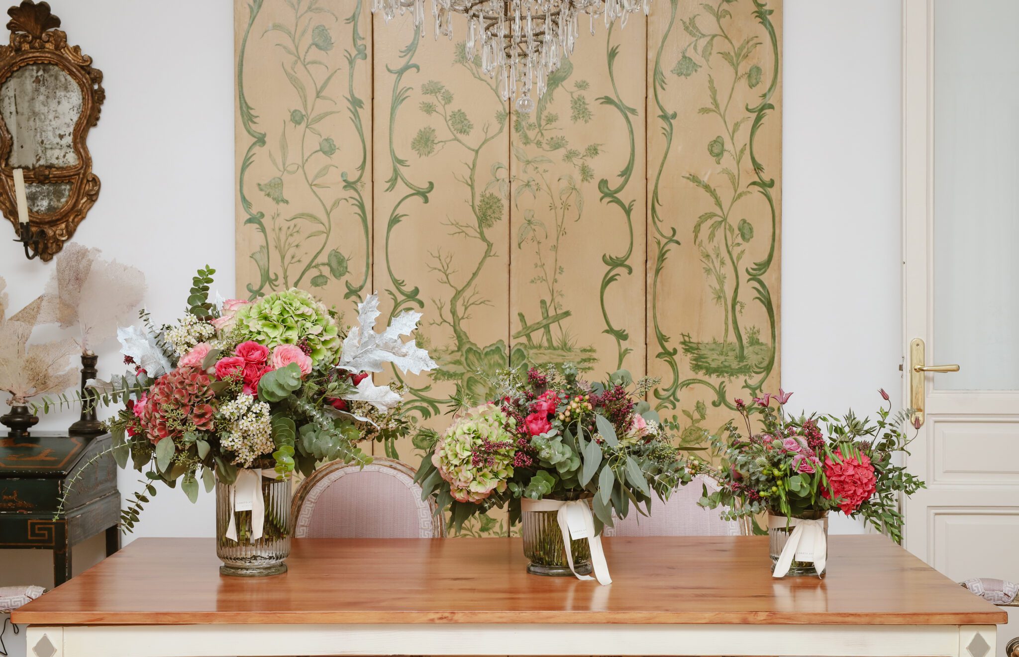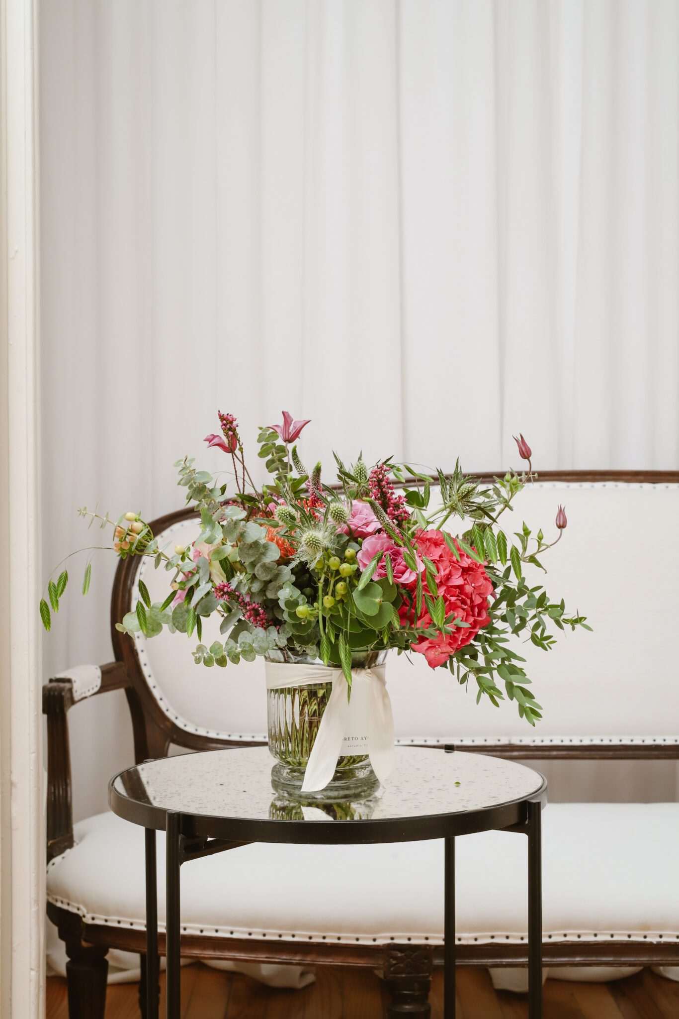 Arreglo floral en jarrón de vidrio, modelo según disponibilidad y tamaño seleccionado, realizado con una cuidada selección de flores de otoño por Loreto Aycuens y acompañado por diferentes verdes de temporada.