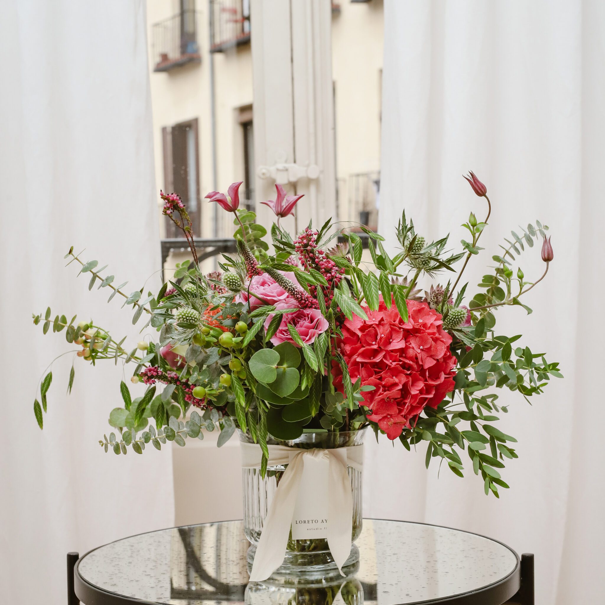 Arreglo floral en jarrón de vidrio, modelo según disponibilidad y tamaño seleccionado, realizado con una cuidada selección de flores de otoño por Loreto Aycuens y acompañado por diferentes verdes de temporada.