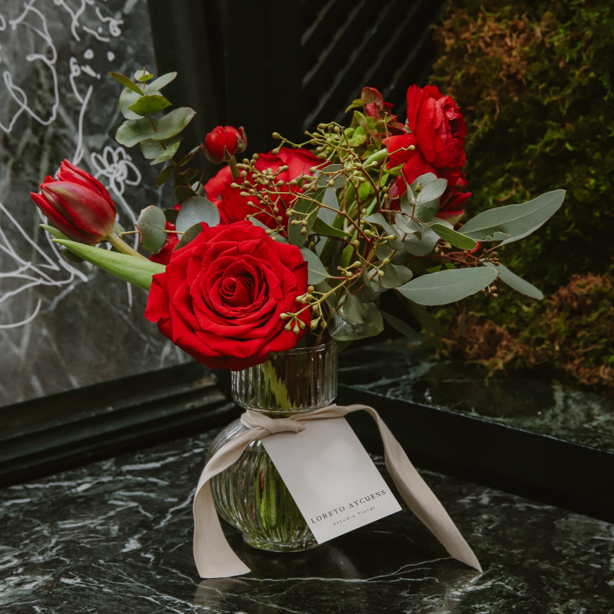 Botellita de San Valentín con flor de temporada roja y verdes