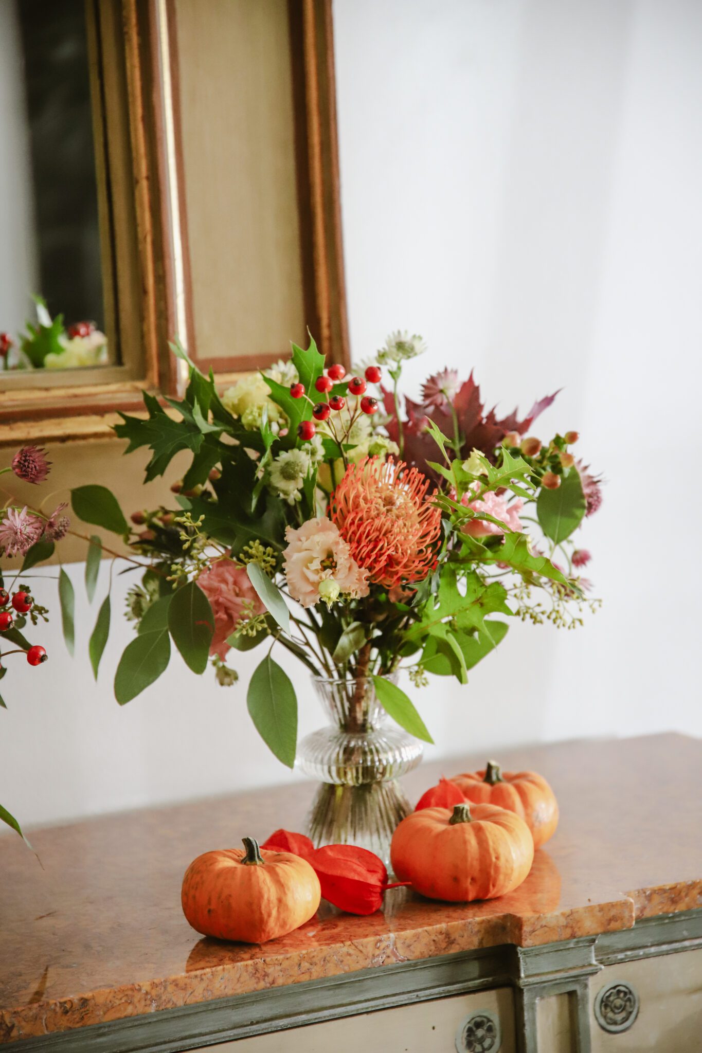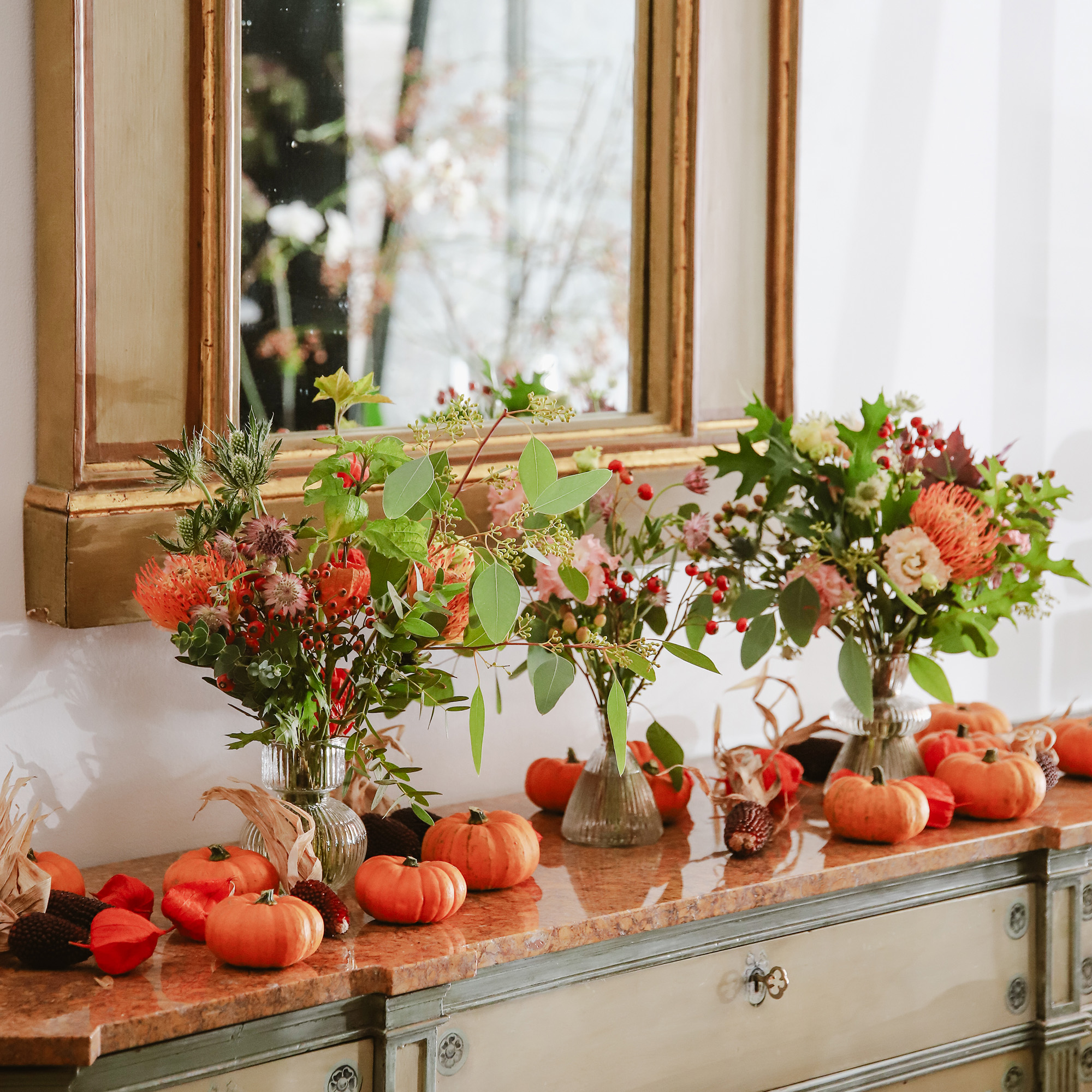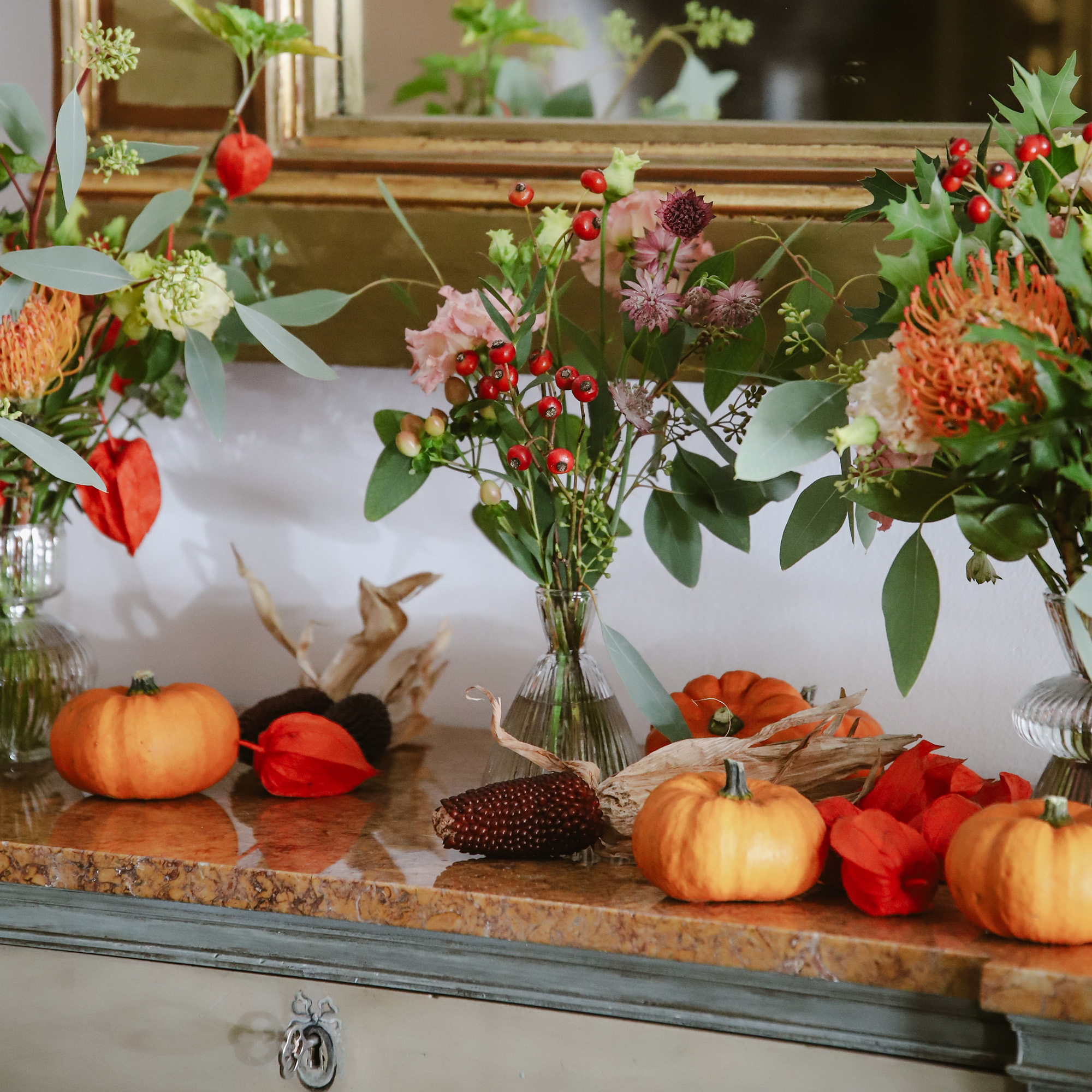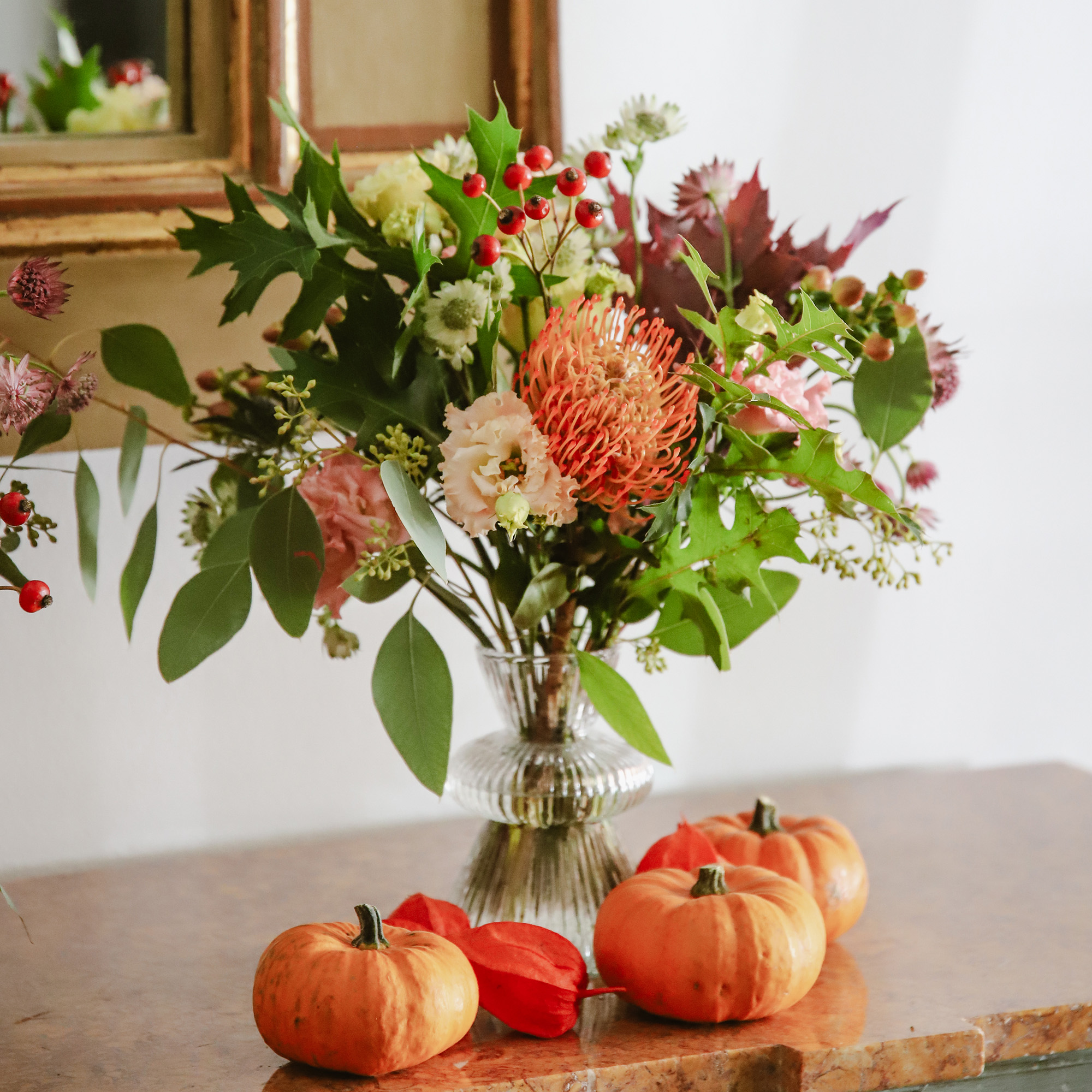 Botellita de cristal con flores de temporada. Disponible en tres modelos de botellitas. El precio es unitario.