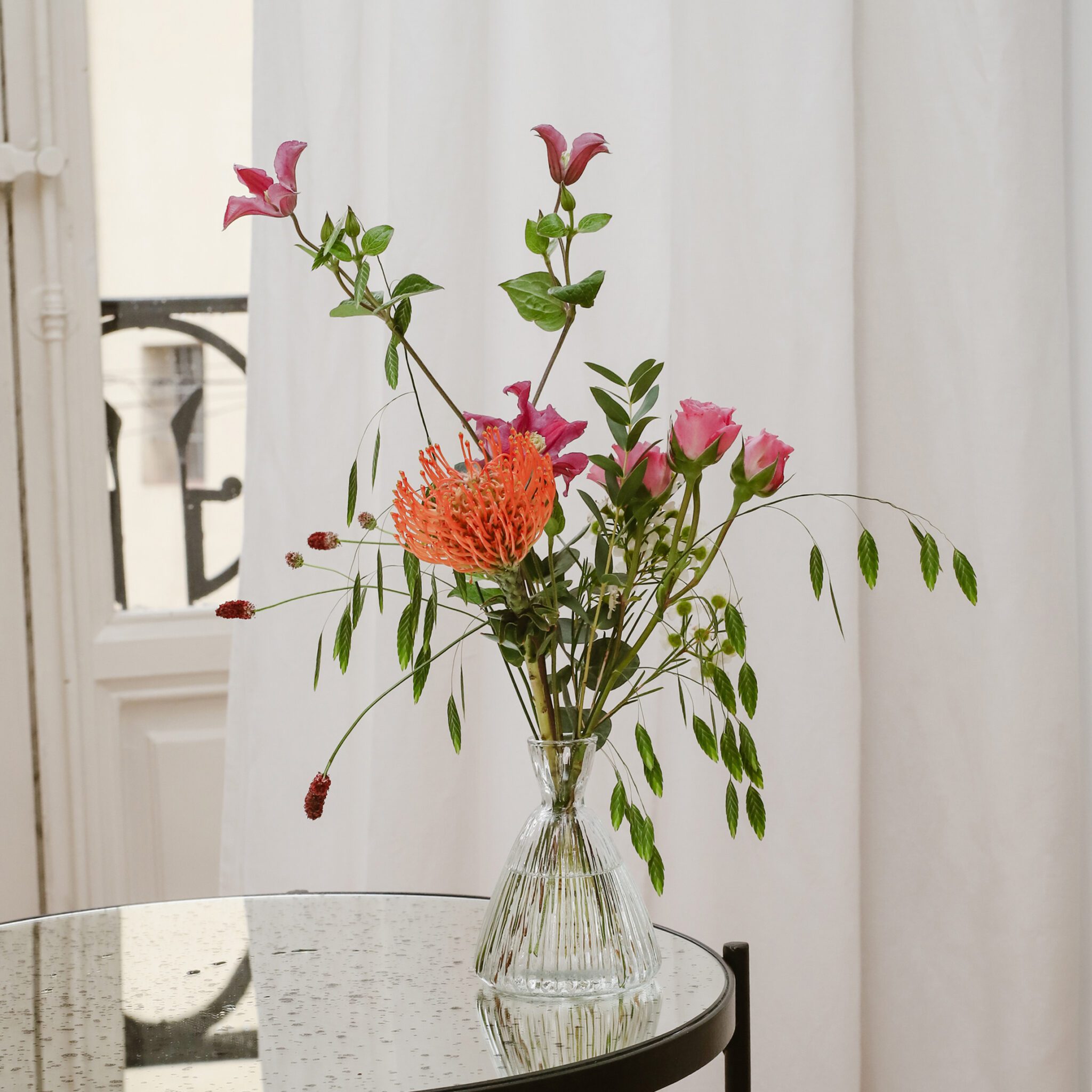 Botellita de cristal con flores de temporada. Disponible en tres modelos de botellitas. El precio es unitario.