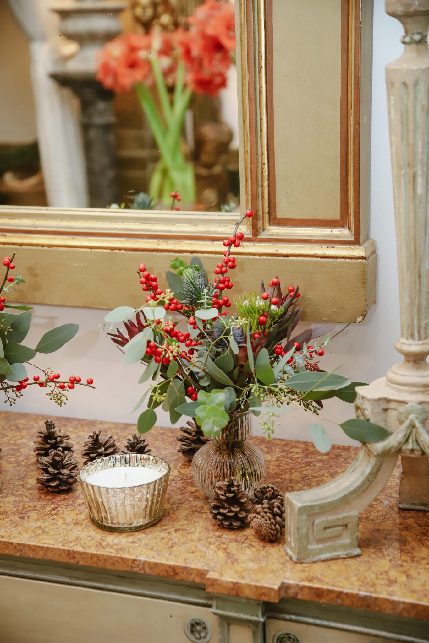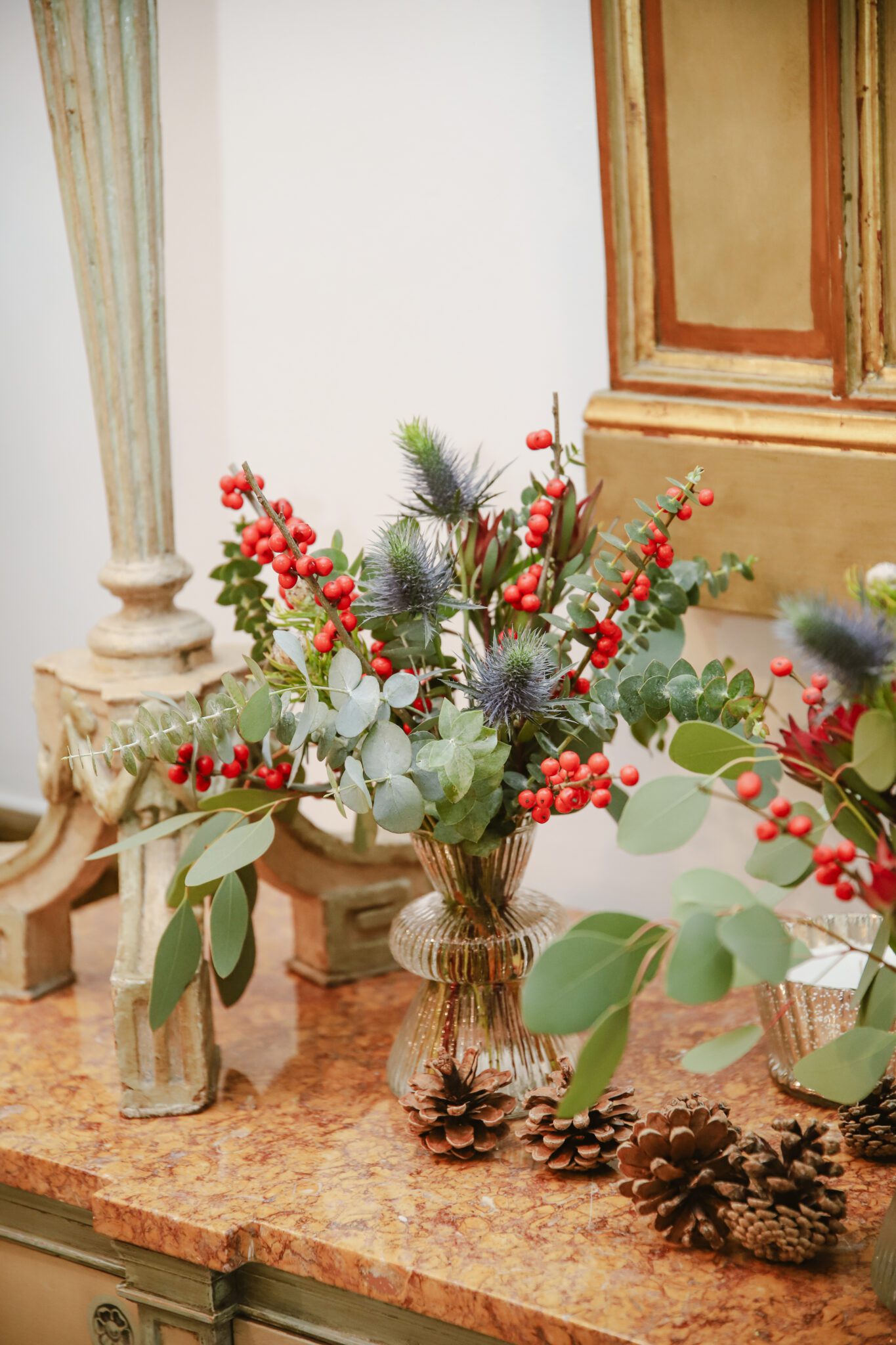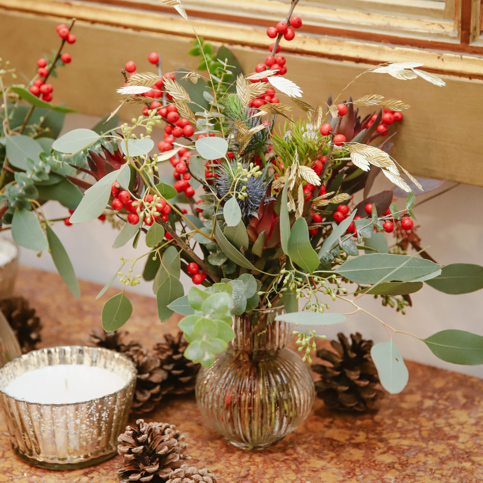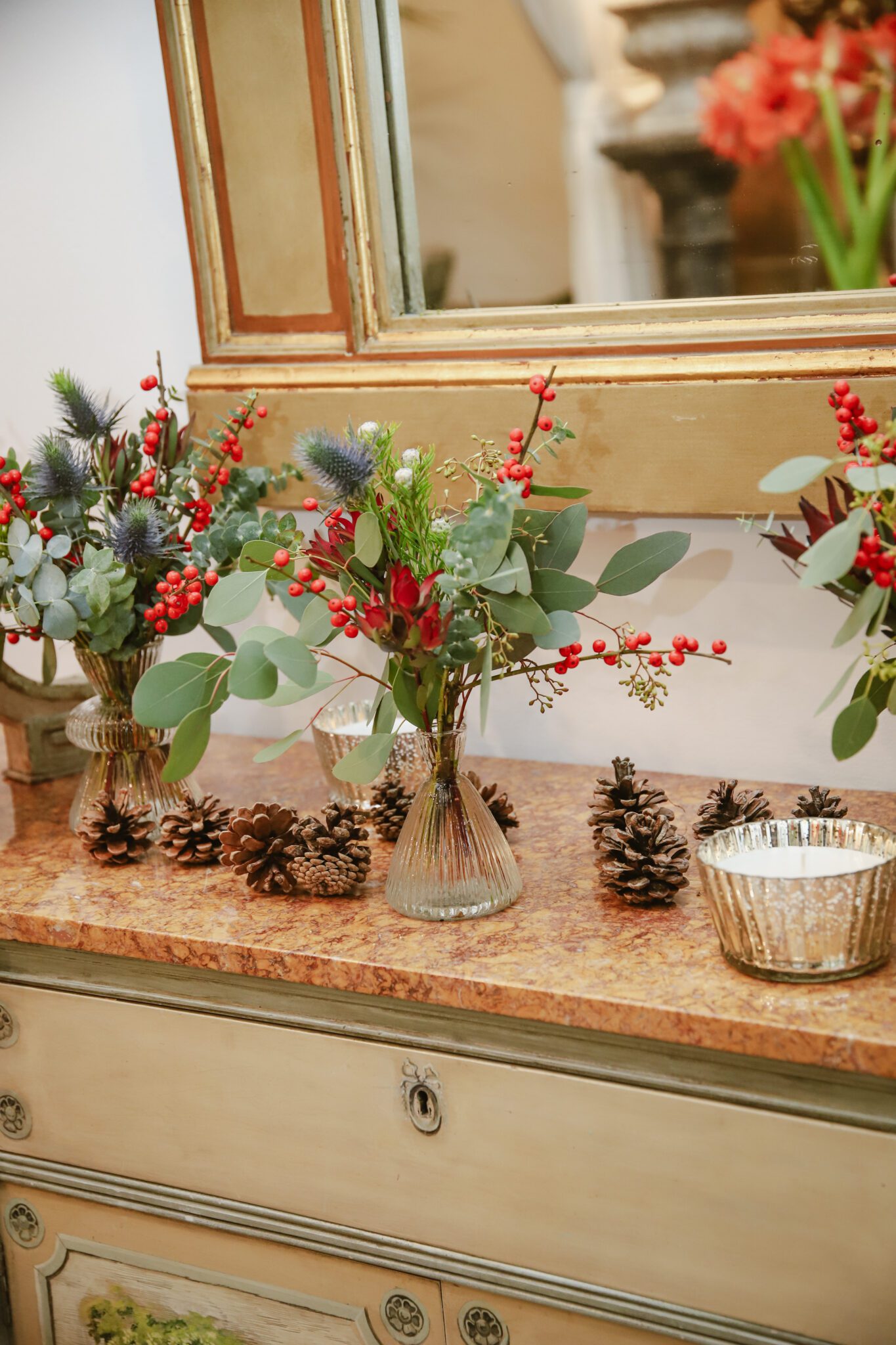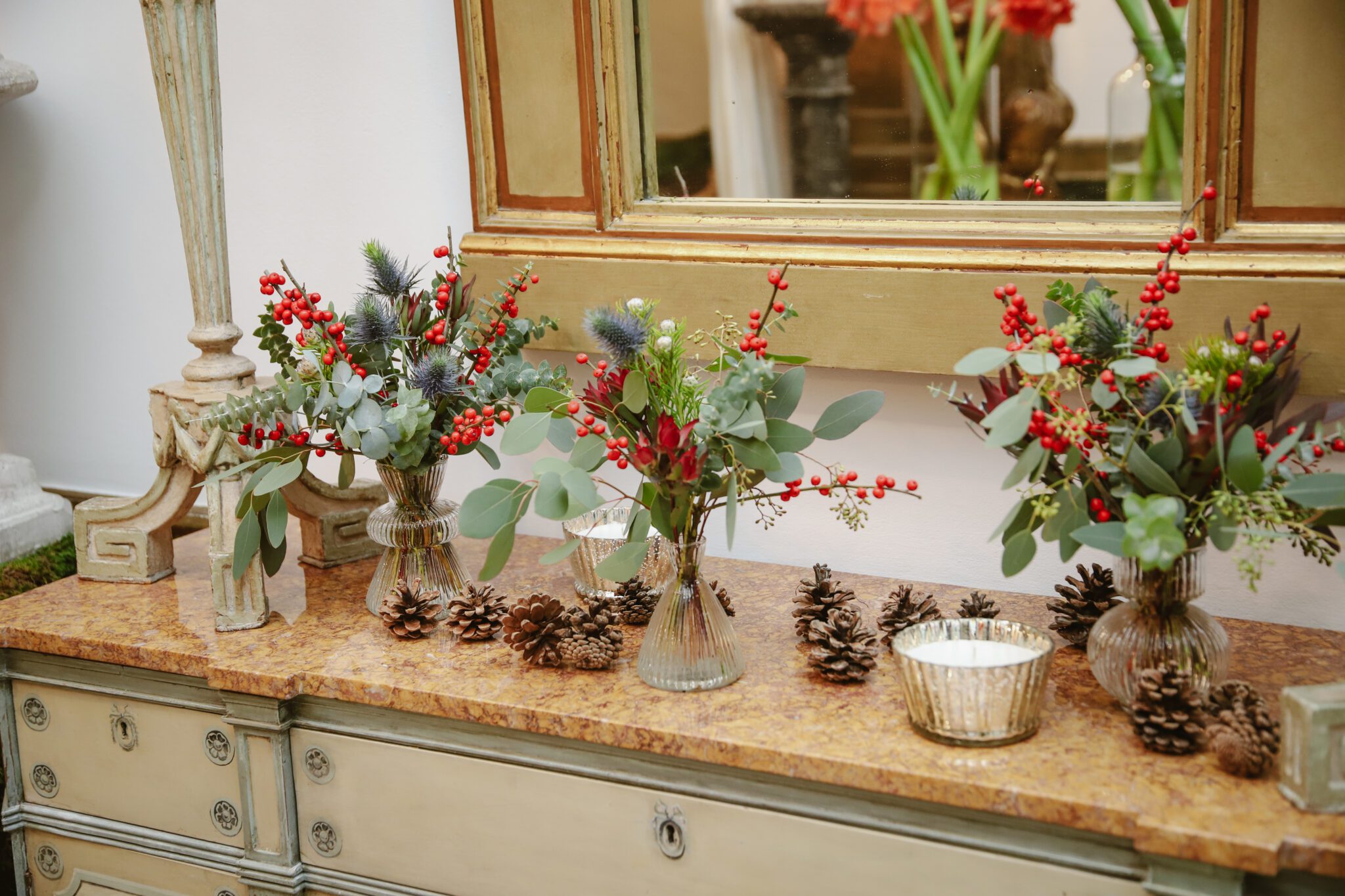 Pack de tres pequeños jarrones con arreglos de Navidad en tonos verdes y rojos con toques dorados, perfectos para decorar mesas.